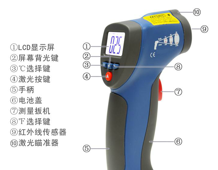 ① 握住儀表手柄并使前端紅外線(xiàn)傳感器指向被測(cè)物體表面;